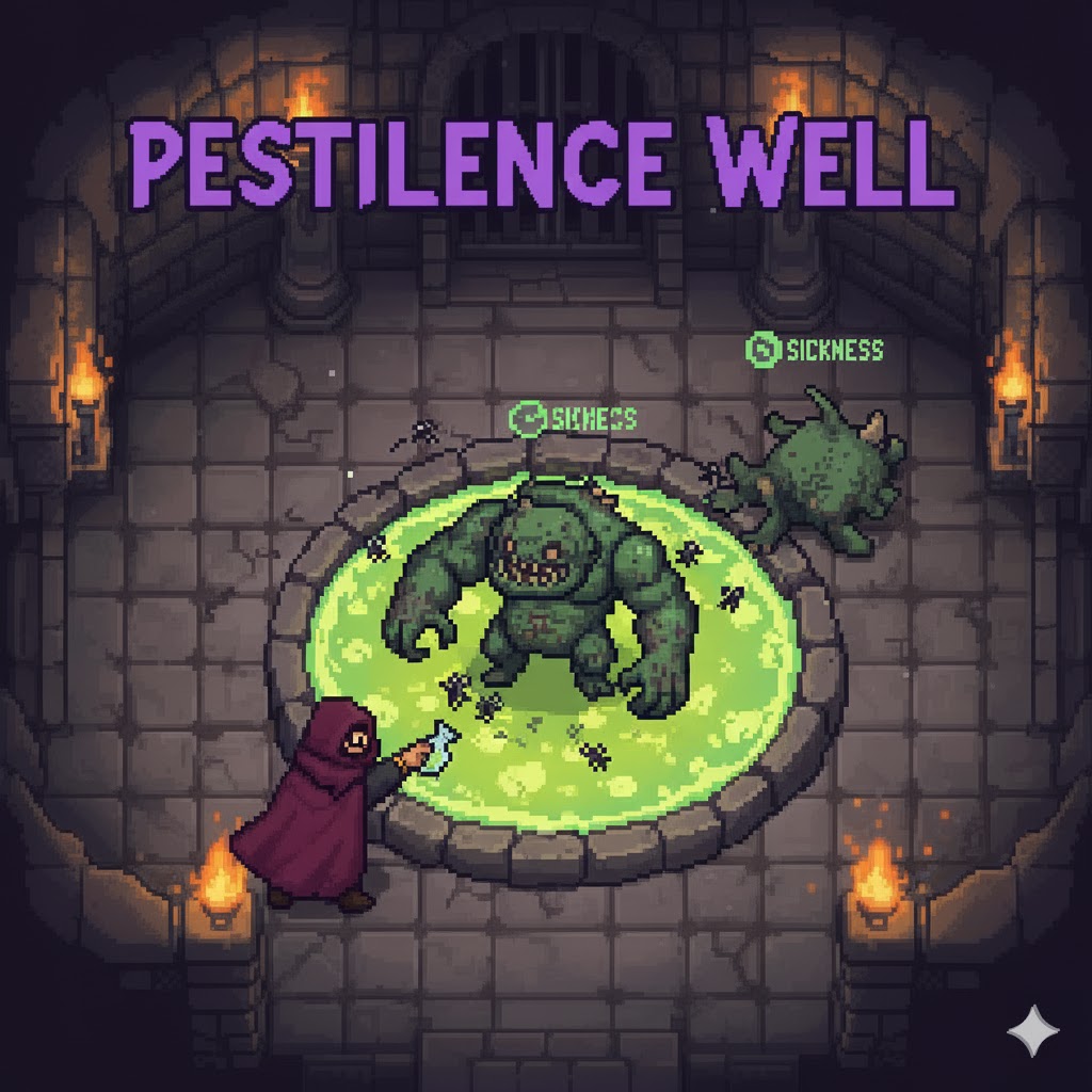 Effect: A glass vial shattering sound is heard as a pool of sickly yellow-green liquid spreads across the ground, bubbling slowly. Small, dark fly sprites buzz visually above the contaminated area.