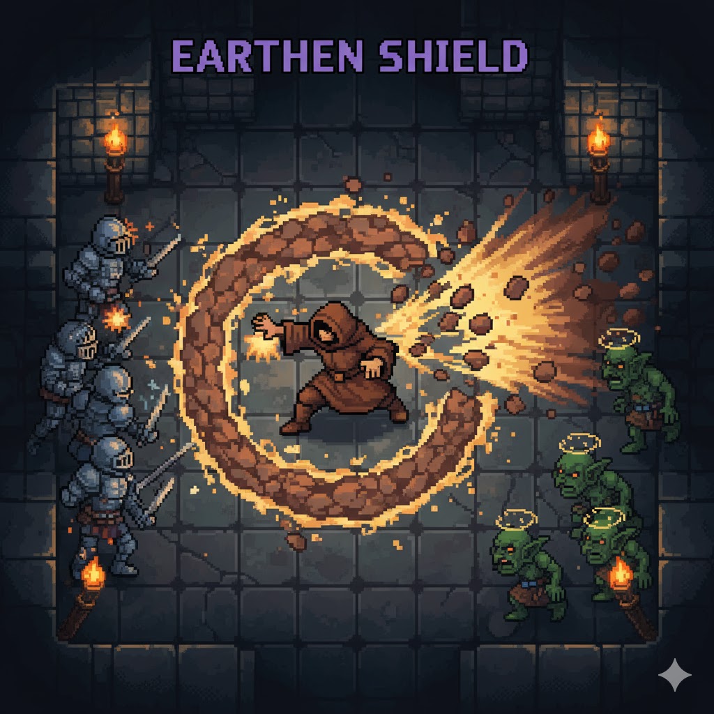 Description: The character slams a hand to the ground, summoning a temporary, swirling barrier of rock and earth.